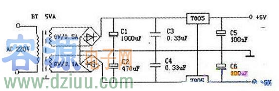 由无源线性集成电路稳压器组成的电源能够提供+12, +9, +5, -5, -9和-12伏的直流电。T1和T2是12伏,3安的变压器。 :