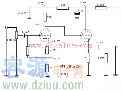 6N1是一只中μ双三极管,μ=35,它具有R低、动态线性宽、频率特性好、噪声低等诸多优点,能承受较强信号输入,并能给出足够的输出,既可用于电压放大,又能用于倒相推动,在20世纪六七十年代可谓名噪一时,是各