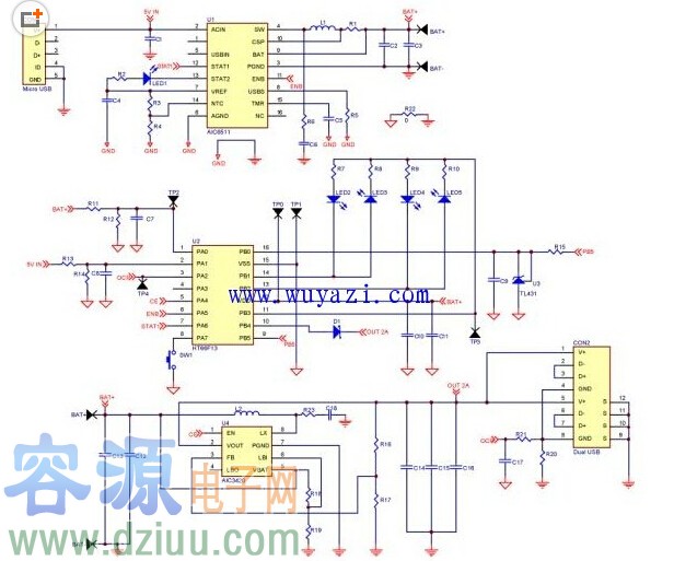 隨著移動(dòng)設(shè)備的增多,移動(dòng)設(shè)備對(duì)電池續(xù)航要求也不斷提高,在移動(dòng)設(shè)備電量不足的情況下,移動(dòng)電源成為人們首先產(chǎn)品,移動(dòng)電源應(yīng)用非常廣泛,要對(duì)移動(dòng)電源不斷要求的情況下,移動(dòng)電源電池管理電路成為控制單元的核心部件,下面介紹一款移動(dòng)電源電路圖: