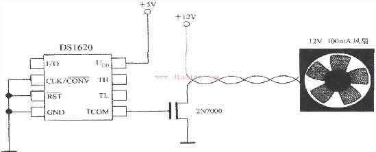 用DS1620监控微处理器的温度时,通过开启或关闭风扇,可改变芯片的散热条件,实现恒温控制,电路如图所示。其特点是将TCOM信号经过2N7000型MOSFET,去控制风扇,当芯片表面温度t>tH时打开