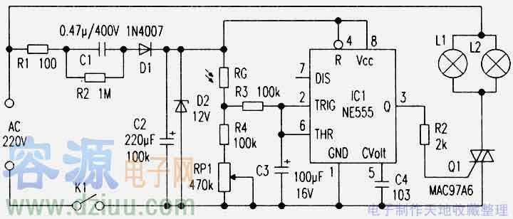 工作原理 电路原理如附图所示,R1、R2、D1、D2,Cl、C2构成12V电源,为整机提供电源电压,NE555及外围元件组成带延时的施密特触发器,电路中RG为光敏电阻,用于检测周围环境的亮度。黄昏时,周围环境的亮度逐渐变暗,RG的阻值也随之变大,IC1的②、⑥脚电位逐渐降低,当电位小于1/3Vcc时,IC1的③脚输出高电平,双向可控硅Q1被触发导通,灯笼中的灯得电被点亮。到了早晨,天空渐渐变亮,RG的阻值逐渐变小,IC1②、⑥脚的电位逐渐升高,当电位高于2/3Vcc时,③脚输出低电平,Q1截止,灯笼中的灯熄灭。因NE555及外围元件构成的施密特触发器的回差电压达1/3Vcc,所以在临界亮度附近时,可以消除灯的闪烁发光现象。同时,为了避免节日的夜晚施放烟花、焰火时使周围亮度发生急剧变化而使灯出现亮/灭闪烁现象,电路中特地加了延时电容C3。