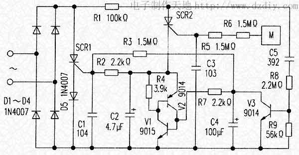 附图所示电路可用于洗衣机或需要吸气/排气的风扇电机定时自动换向运转电路。图中虚线框内是电机M的电原理图,C为裂相电容器,用作产生旋转磁场使M转动。L1、L2是参数完全相