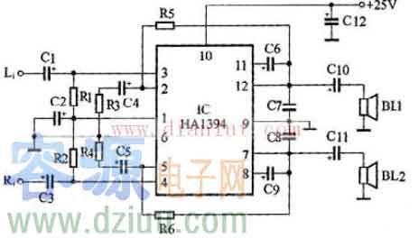 采用雙音頻功放集成電路HA1394,③腳和④腳分別為左、右聲道信號輸入端,12腳和7腳分別為左、右聲道功放輸出端! 1、C3分別為左、右聲道輸入耦合電容,C10、Cll分別為左、右聲道輸出耦合電容。電路電壓增益為