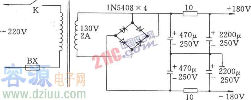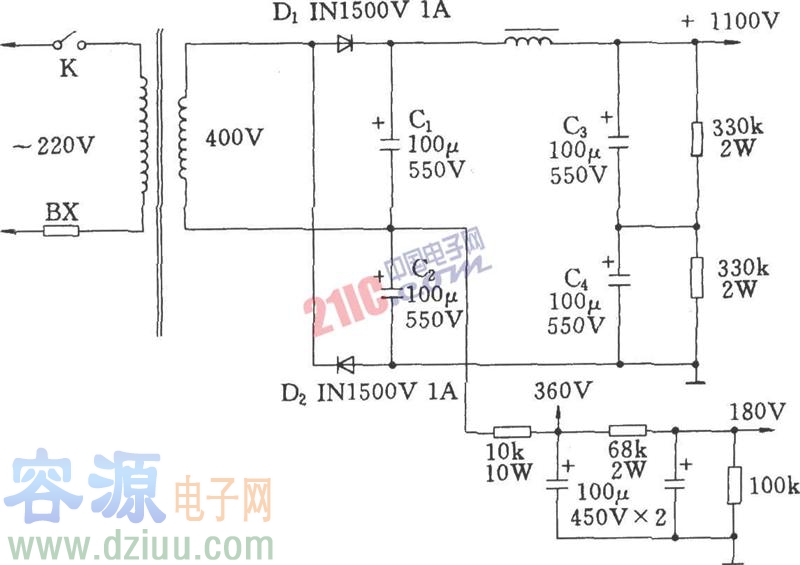 如图所示为用于电子管功放的高压倍压电路,1100V高压可供给211、811、845等高屏压功放管使用。 :