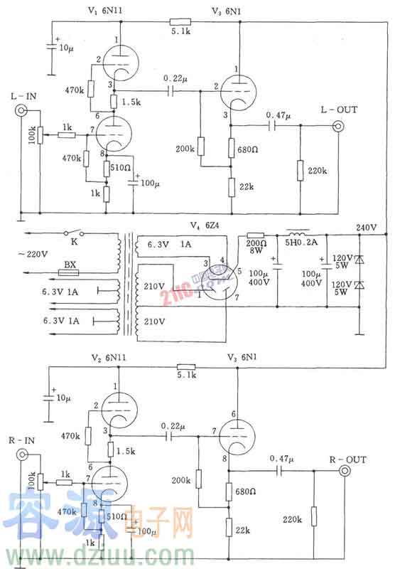 如图所示:电子管输入电压放大器根据输入阻抗的不同,可分为高阻抗输入与低阻抗输入两种方式。其输入方式主要按各种音源设备对负载阻抗匹配要要求来决定的。