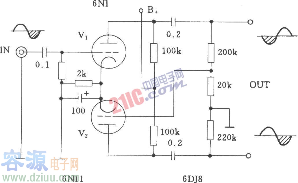 分压式电子管倒相电路主要由6N1及简单元件构成。 电子管,是一种在气密性封闭容器(一般为玻璃管)中产生电流传导,利用电场对真空中的电子流的作用以获得信号放大或振荡的电子器件。早期应用于电视机、收音机扩