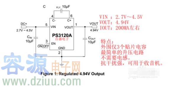 无电感升压5V200MA,外围只需3个电容。是的,3个10uf的贴片电容即可。最简单的升压电路了。抗干扰强,可用于收音机类产品。