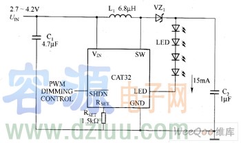 CAT32是一个DC/DC升压变换器,它的输出电流可调。当工作在1.2MHz的固定频率下时,CAT32可使用电感值很小的外部电感器和电容值很小的陶瓷电容。 CAT32可用来驱动多个串联的白光LED,并提供可调的电流来控制亮